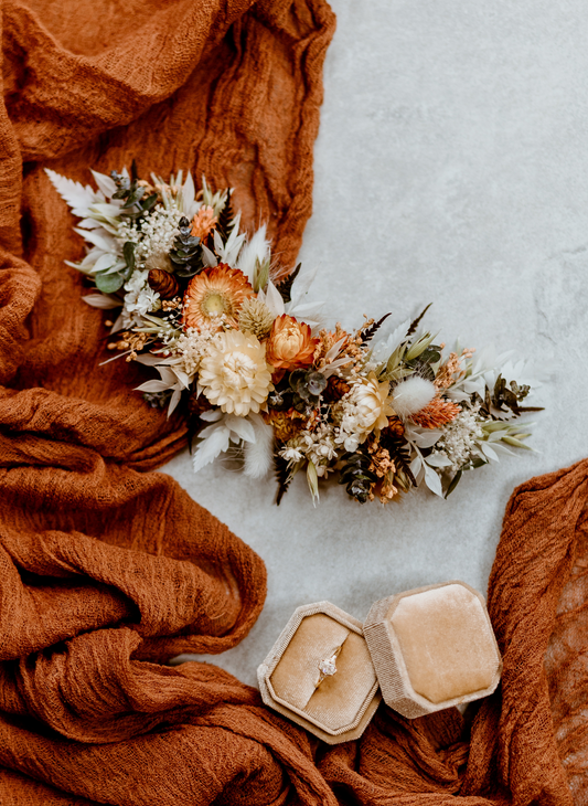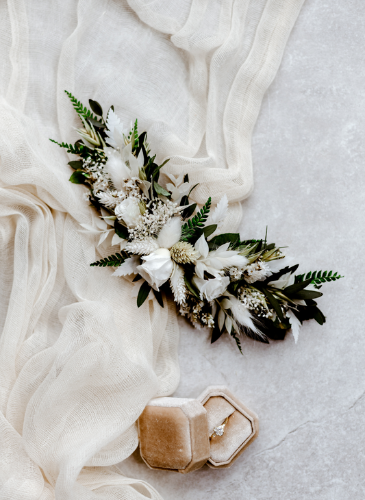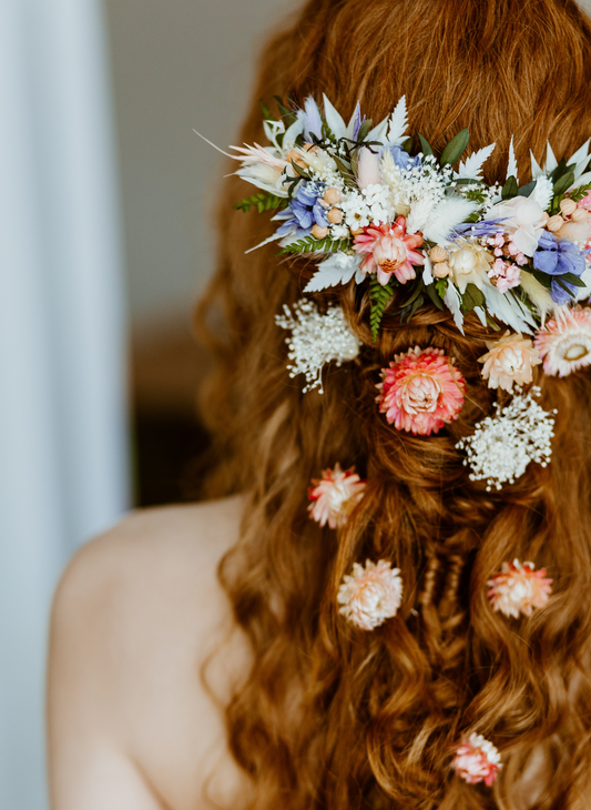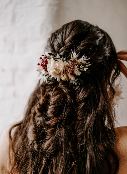 Our bridal hair combs are made with dried and preserved flowers, combining delicate design with a wild, bohemian soul. Perfect for brides, bridesmaids or flower girls looking for a lightweight yet lasting floral accessory.