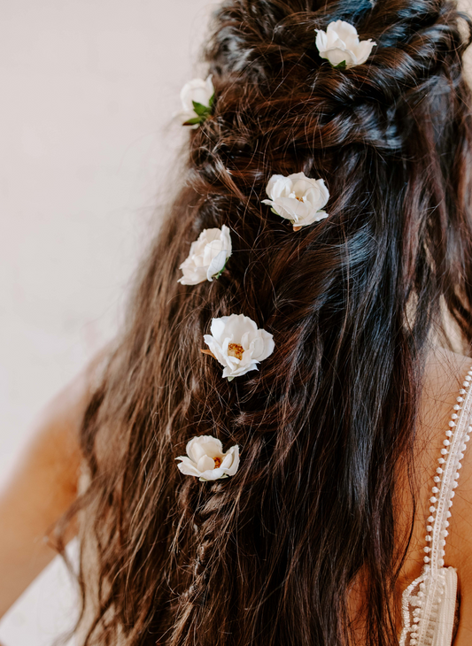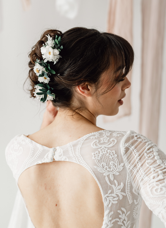 Hair pins are a subtle but stunning way to add flowers to your bridal look. These lightweight pieces tuck neatly into updos or loose waves, bringing a touch of wild beauty to your hair. Perfect for brides, bridesmaids or wedding guests.
