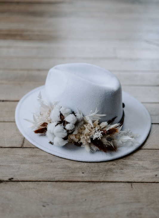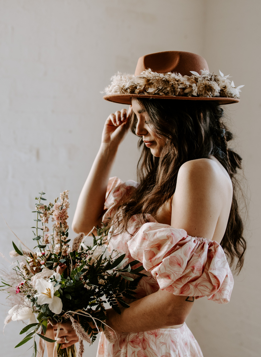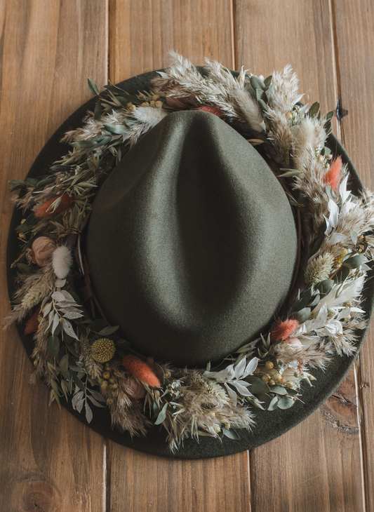Looking for something different? Our dried flower fedora hats are a statement accessory for bohemian brides, festival goer's or anyone who loves a little drama with their florals. Handmade to order with our signature style.