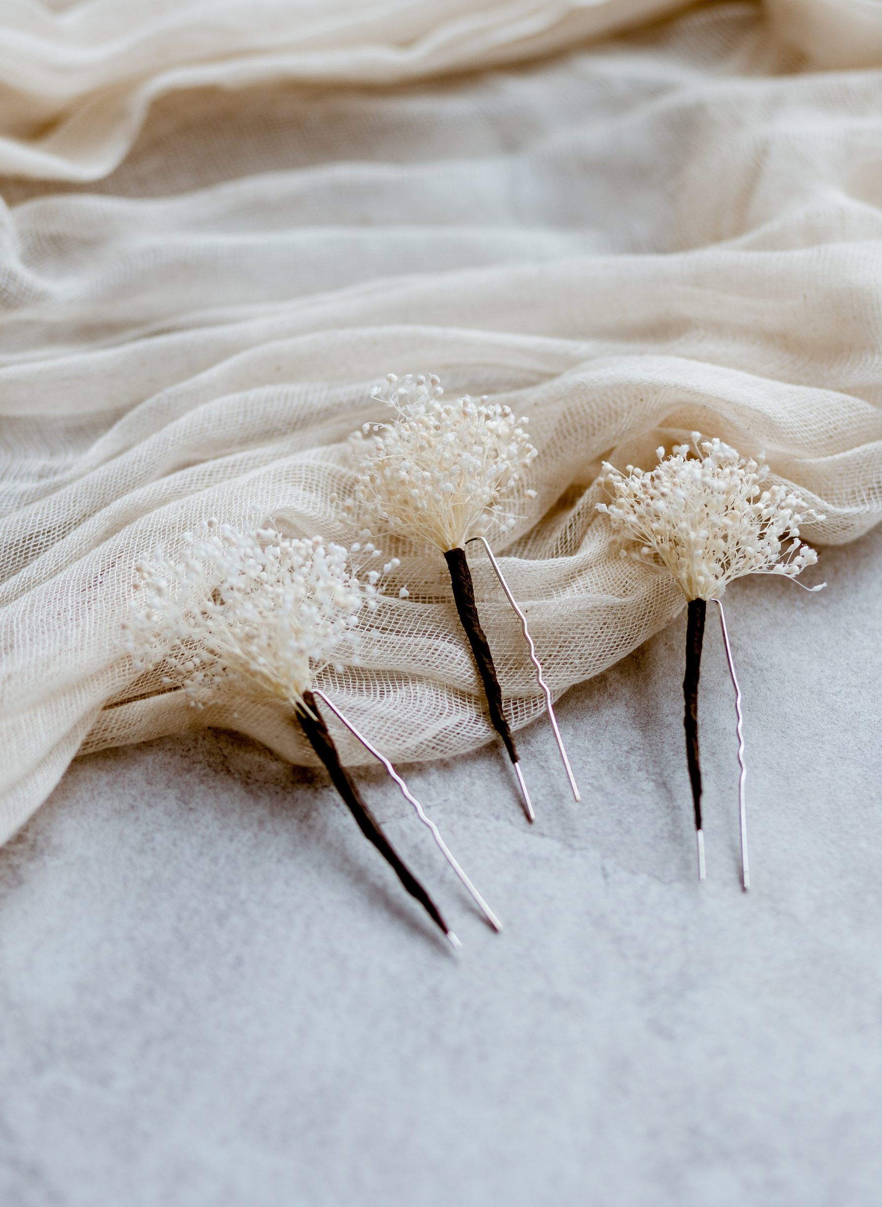 Discover the beauty of "Liberty," a collection of handmade dried flower hair pins crafted to bring natural charm to bridal or bridesmaid hairstyles. Each pin features a delicate cluster of preserved ivory gypsophila, artfully attached to a silver metal longline bridal hair pin. With their soft, romantic appeal, these pins are perfect for scattering throughout loose curls, accenting braided styles, or enhancing a graceful updo.